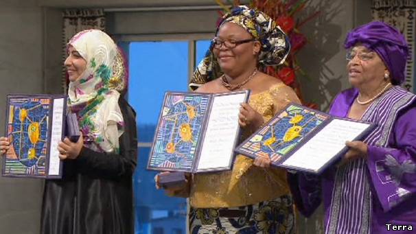 правозащитница Лейма Гбови и активистка из Йемена Таваккул Карман.